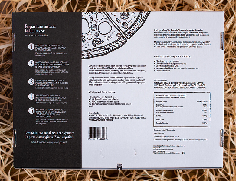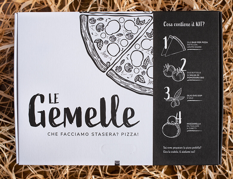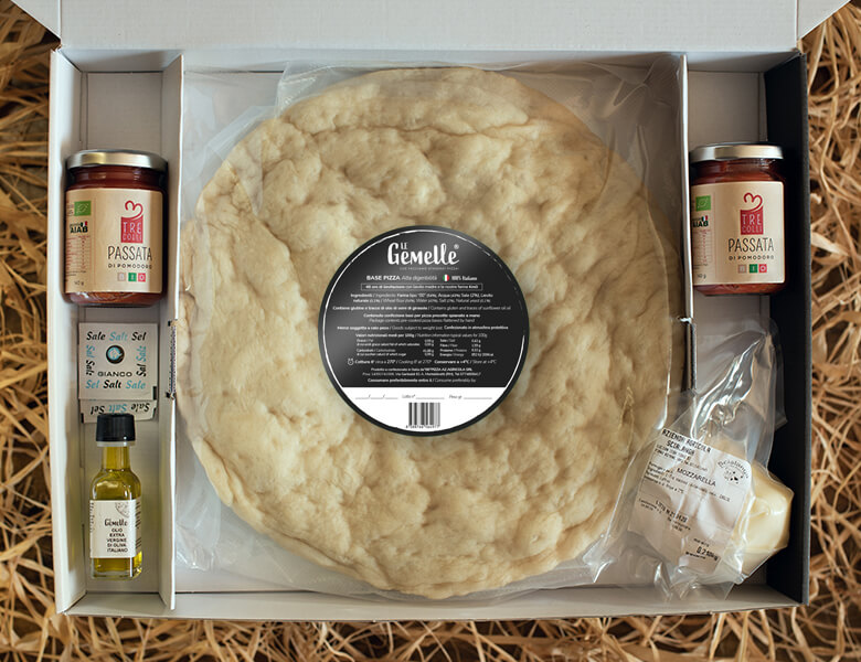 Il kit per pizza “Le Gemelle” è pensato per te che sei un entusiasta della pizza con tanta voglia di metterti alla prova: ora potrai creare la tua pizza a casa, utilizzando solo ingredienti selezionati e di alta qualità, 100% italiani. Mozzarella di latte vaccino, salsa di pomodoro bio, Olio Evo DOP, e due basi per la pizza in atmosfera protettiva, fatte con pasta madre lievitata 48 ore: tutto il necessario per preparare una vera pizza.